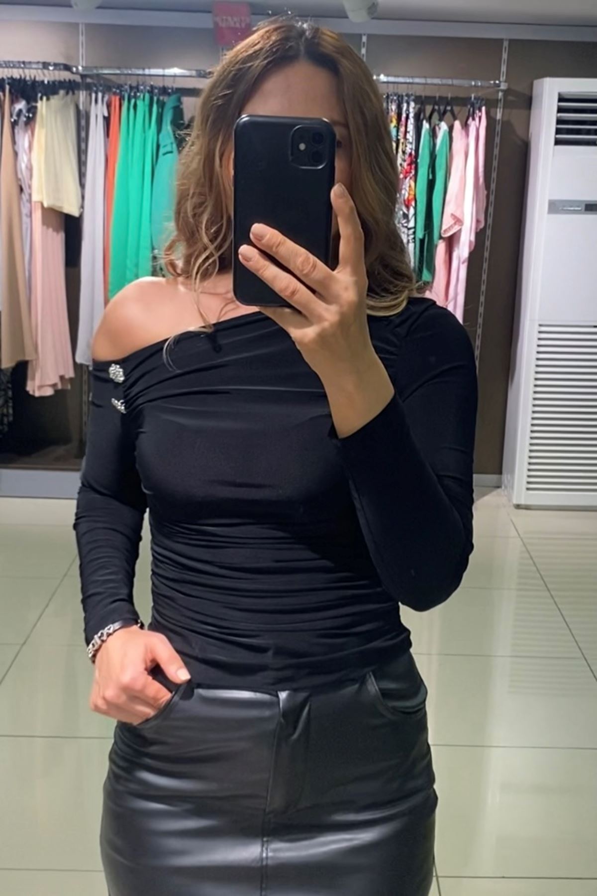 Yakası Düğme Aksesuarlı Sandy Doku Bluz-Siyah