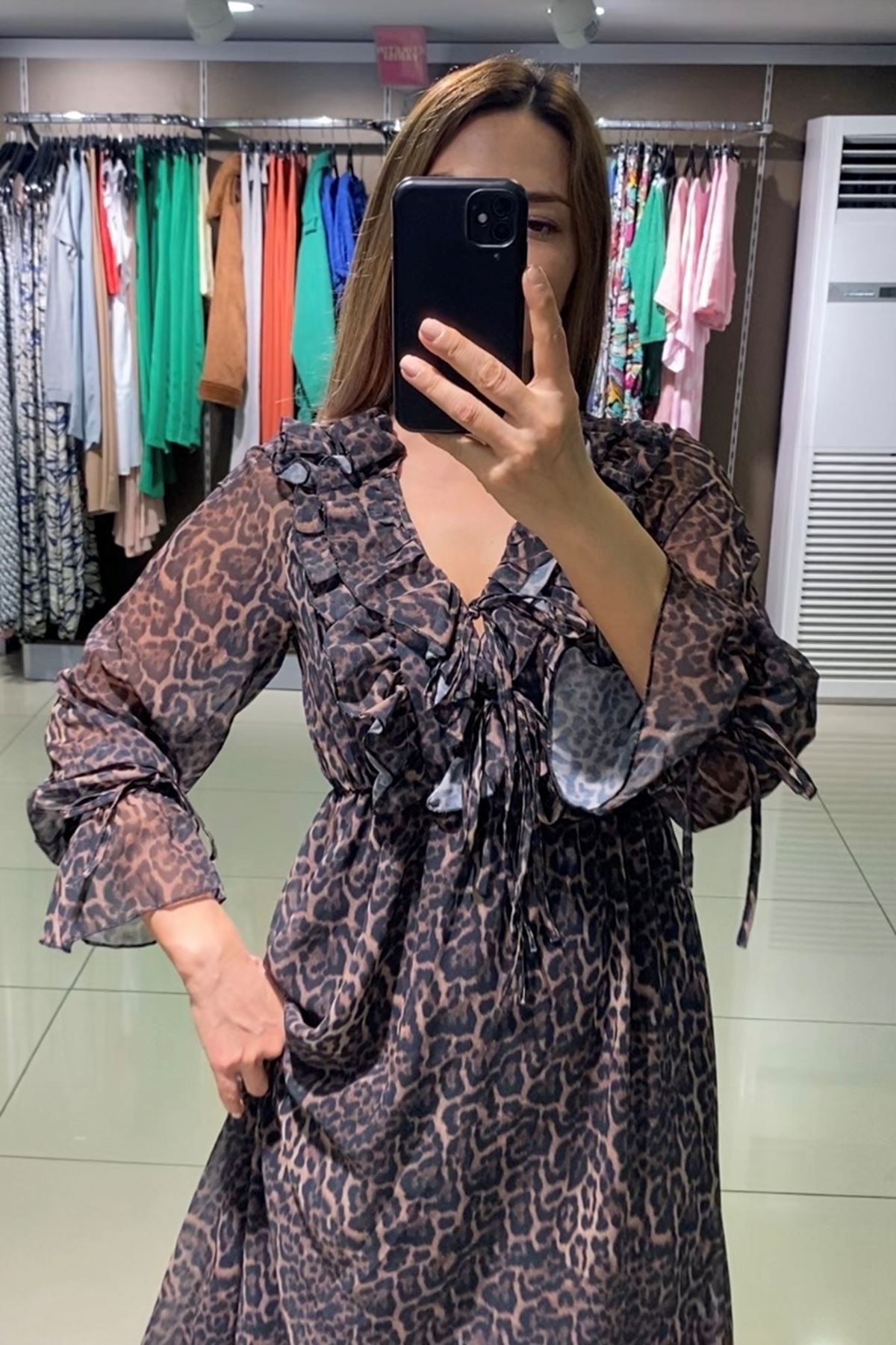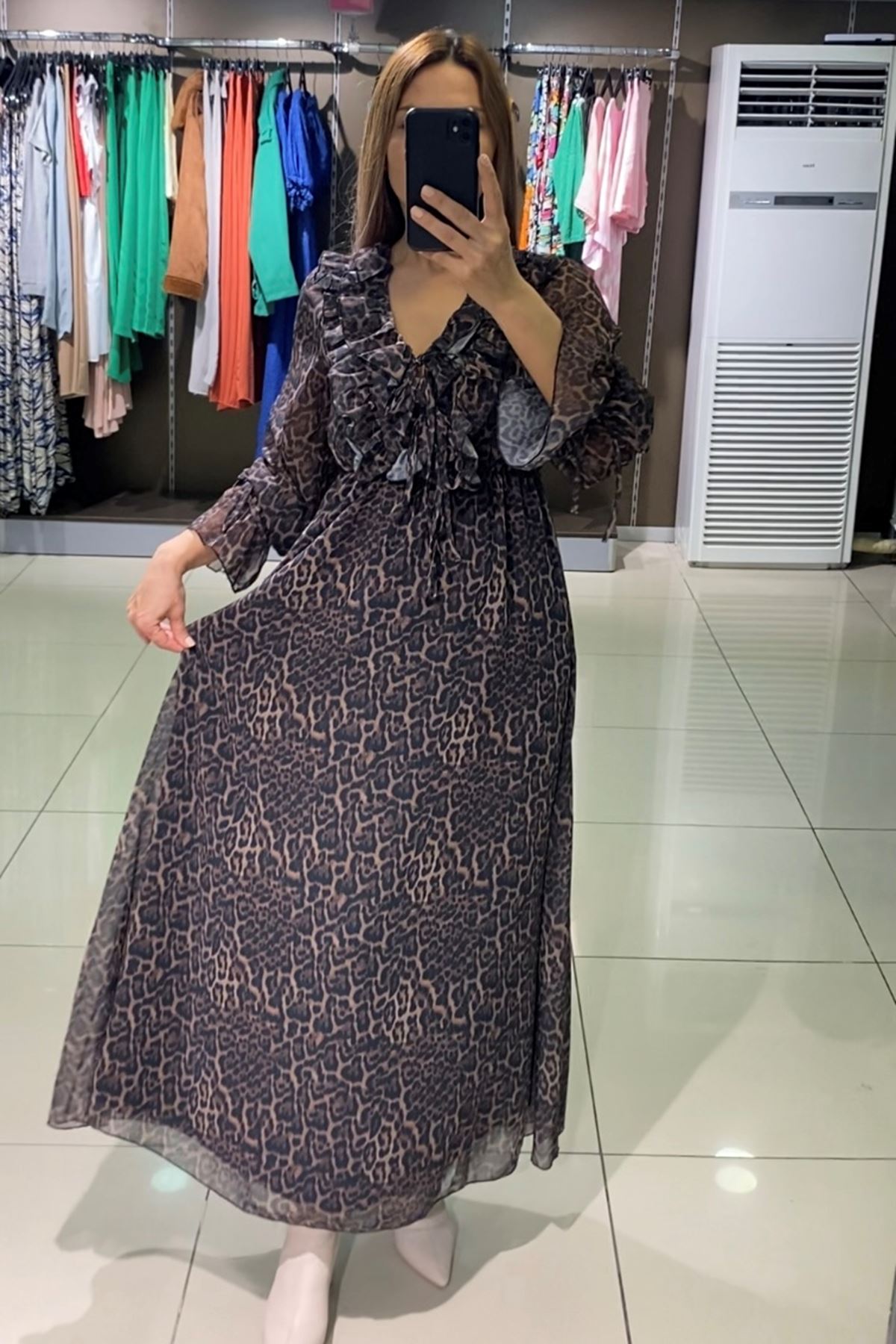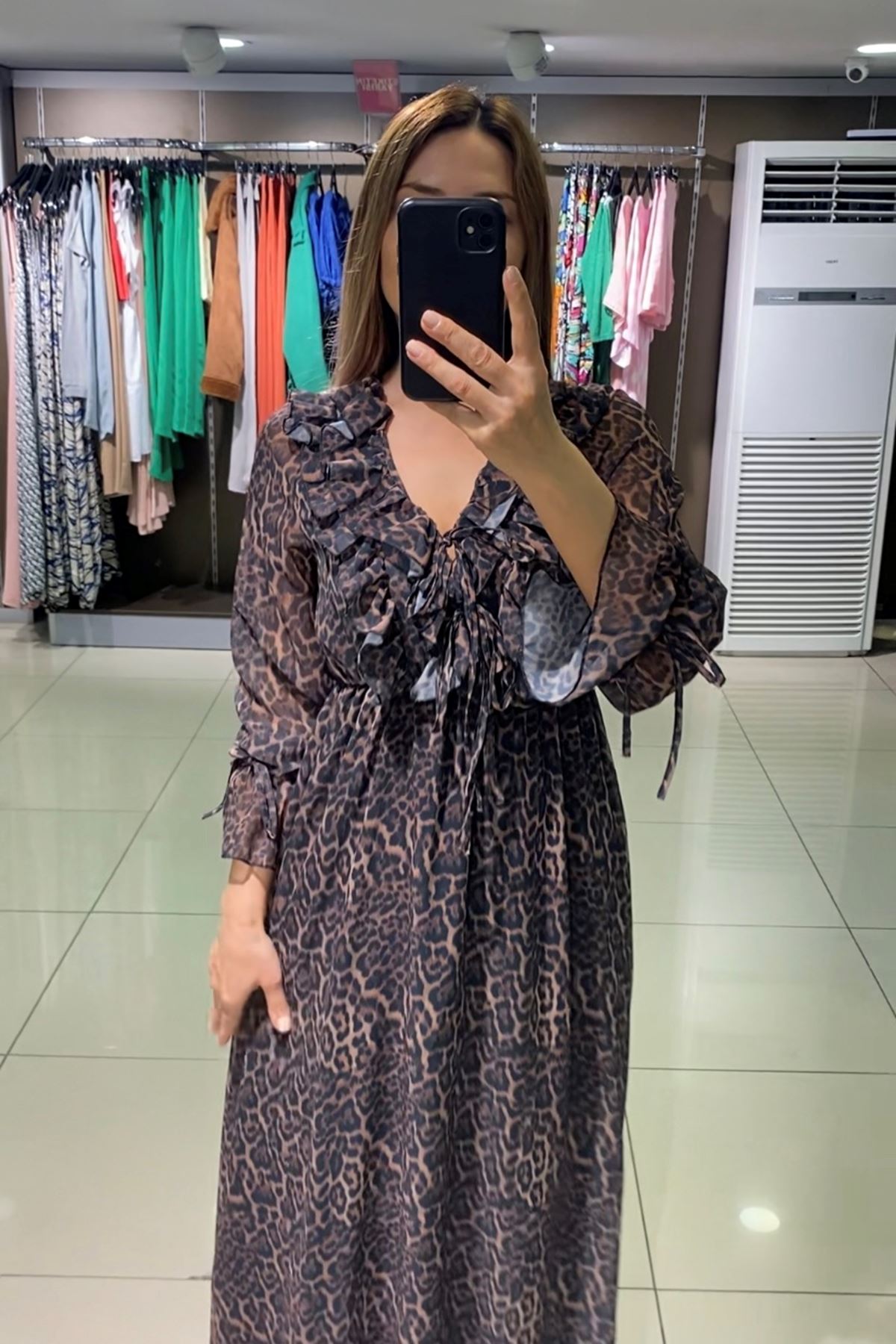 Yakası Volanlı Leopar Desen Midi Boy Elbise