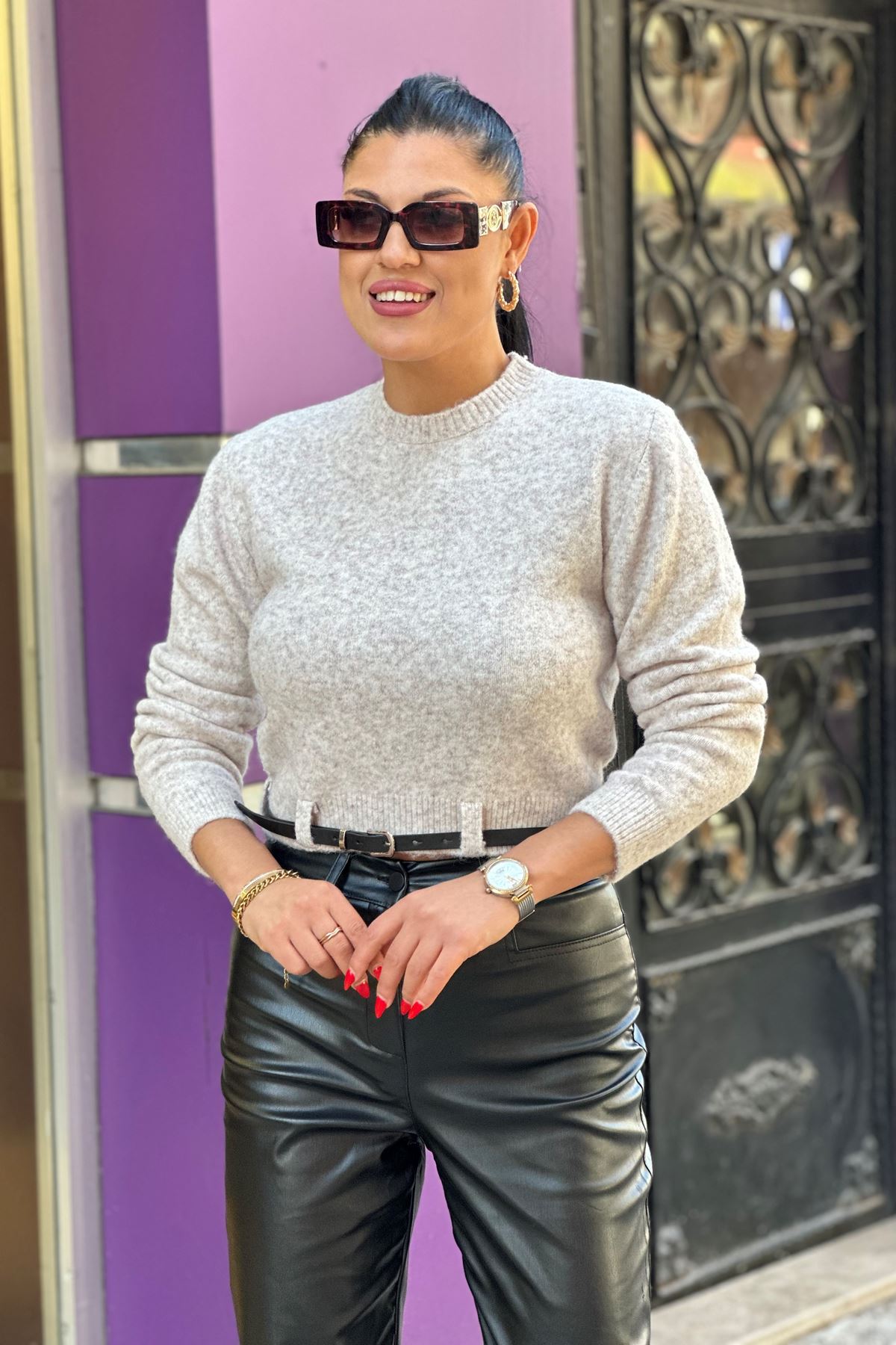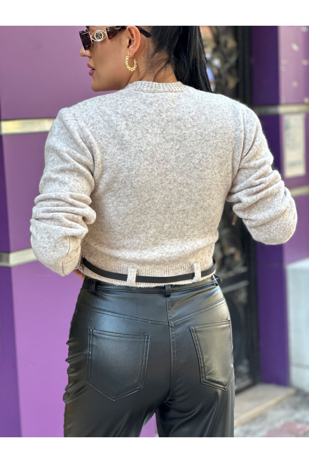 Yuvarlak Yaka Bel Kemerli Yün Kazak