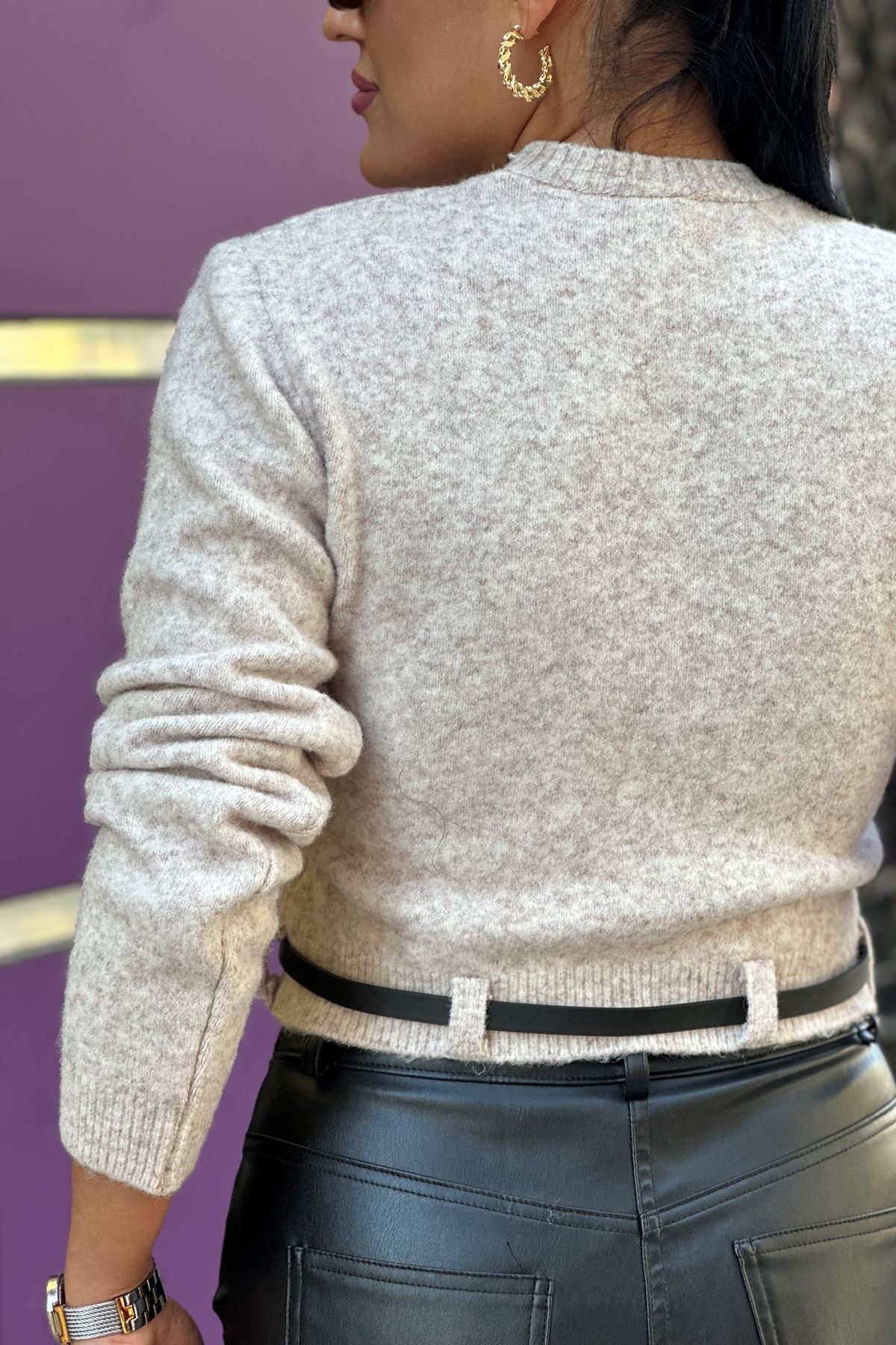 Yuvarlak Yaka Bel Kemerli Yün Kazak-Krem